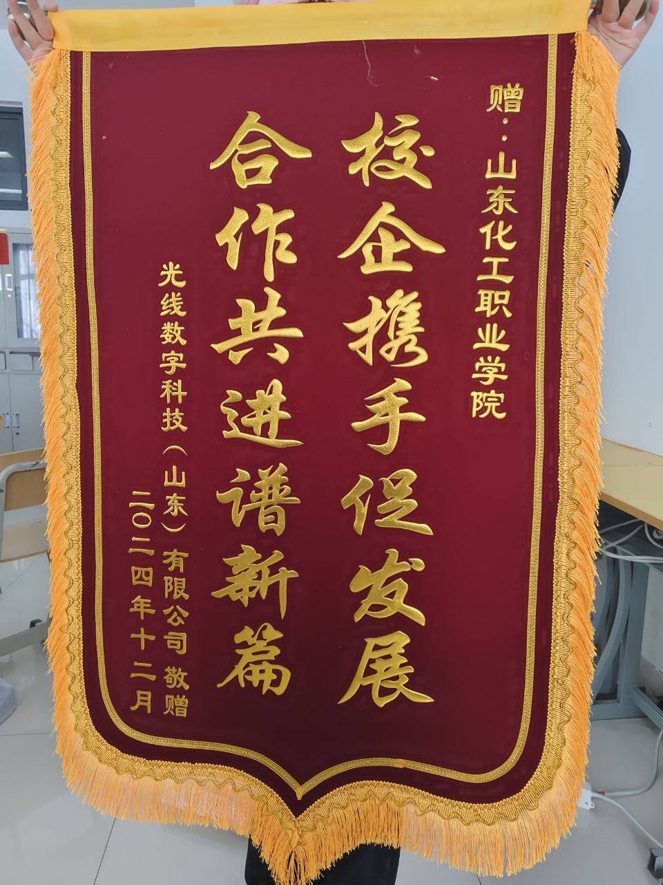 2024年12月,光线数字科技(山东)有限公司向山东化工职业学院送上一面意义非凡的锦旗,锦旗上的“校企携手促发展,合作共进谱新篇”不仅是对双方过往合作成果的肯定,更是对未来深度协作的美好展望。