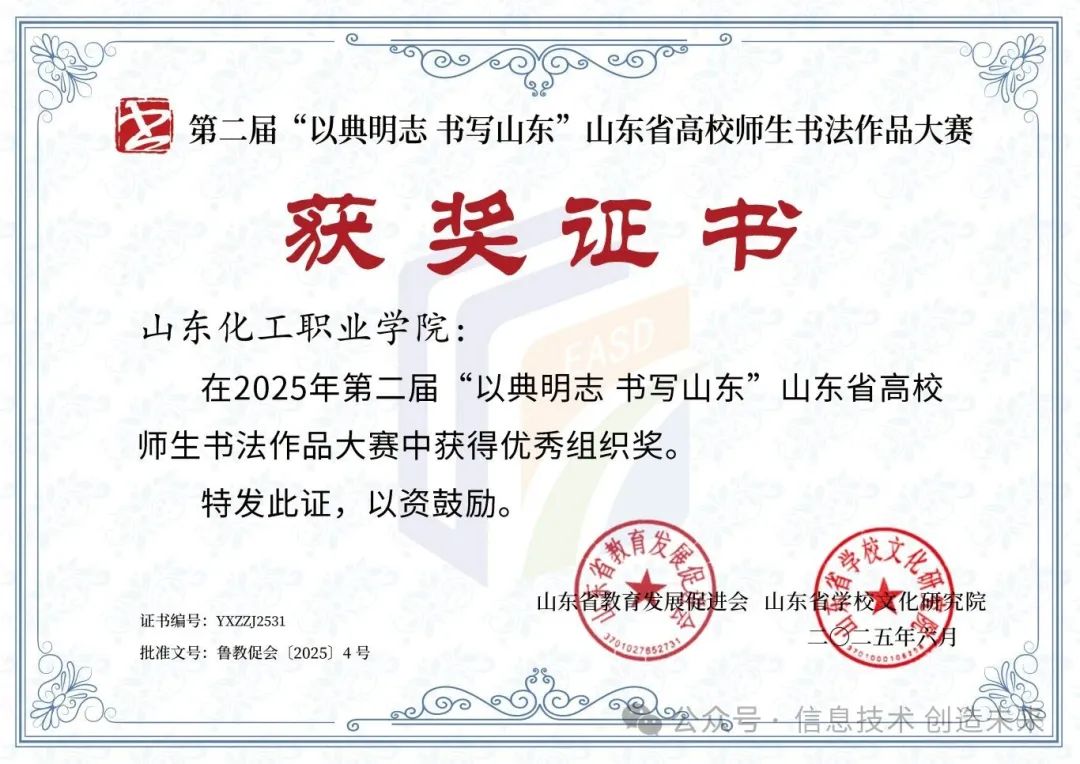集体荣誉闪耀山东化工职业学院荣获优秀组织奖,这份荣誉是学校重视文化艺术的成果体现,彰显学校在书法艺术传承与推广中的积极作为。