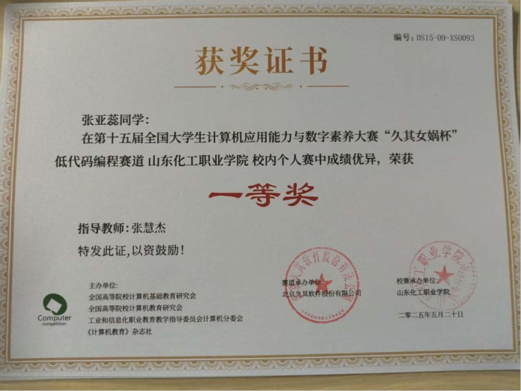 从校内赛的一等奖到国际赛的二等奖,从Java开发赛道到AI应用开发领域,张亚蕊的成长轨迹,是在键盘敲击声中积累的技术沉淀,是与团队并肩作战的协作成果,更是对计算机领域永不停歇的探索——她拿下第十五届全国大学生计算机能力赛低代码编程赛道校内个人赛一等奖、区域团队赛二等奖,斩获第十六届蓝桥杯山东赛区Java软件开发二等奖,与队友携手摘得2025一带一路暨金砖国家技能赛AI应用开发选拔赛二等奖,还在山东省大学生软件设计大赛中收获三等奖。每一张证书,都是她用专业能力书写的青春答卷。